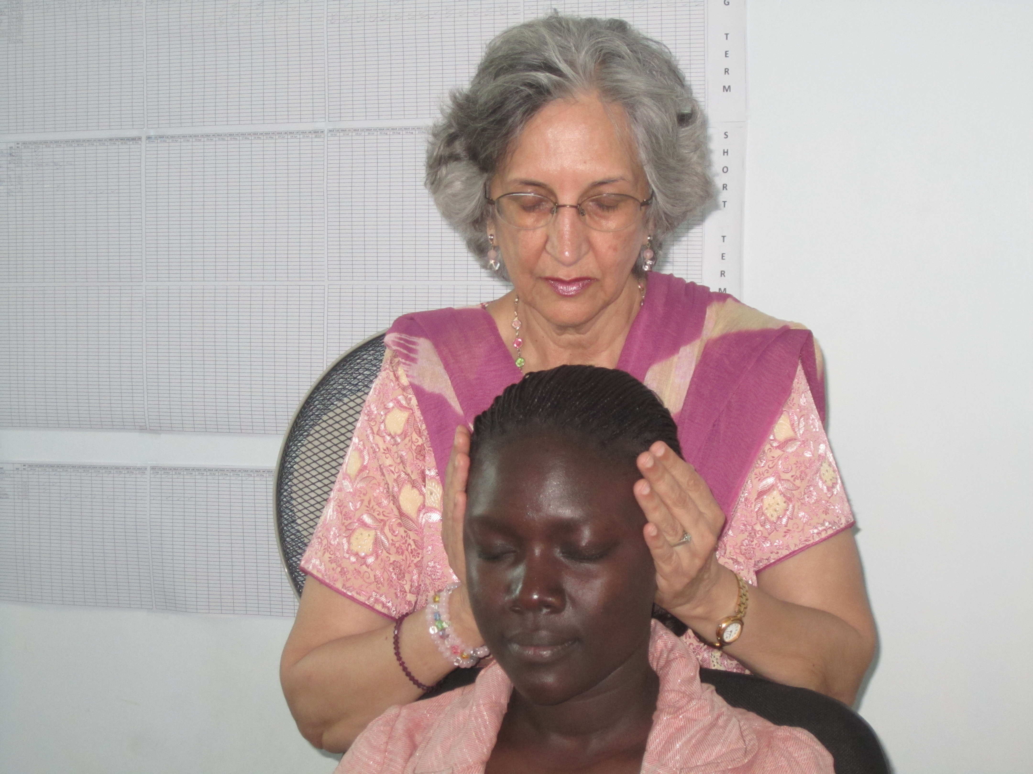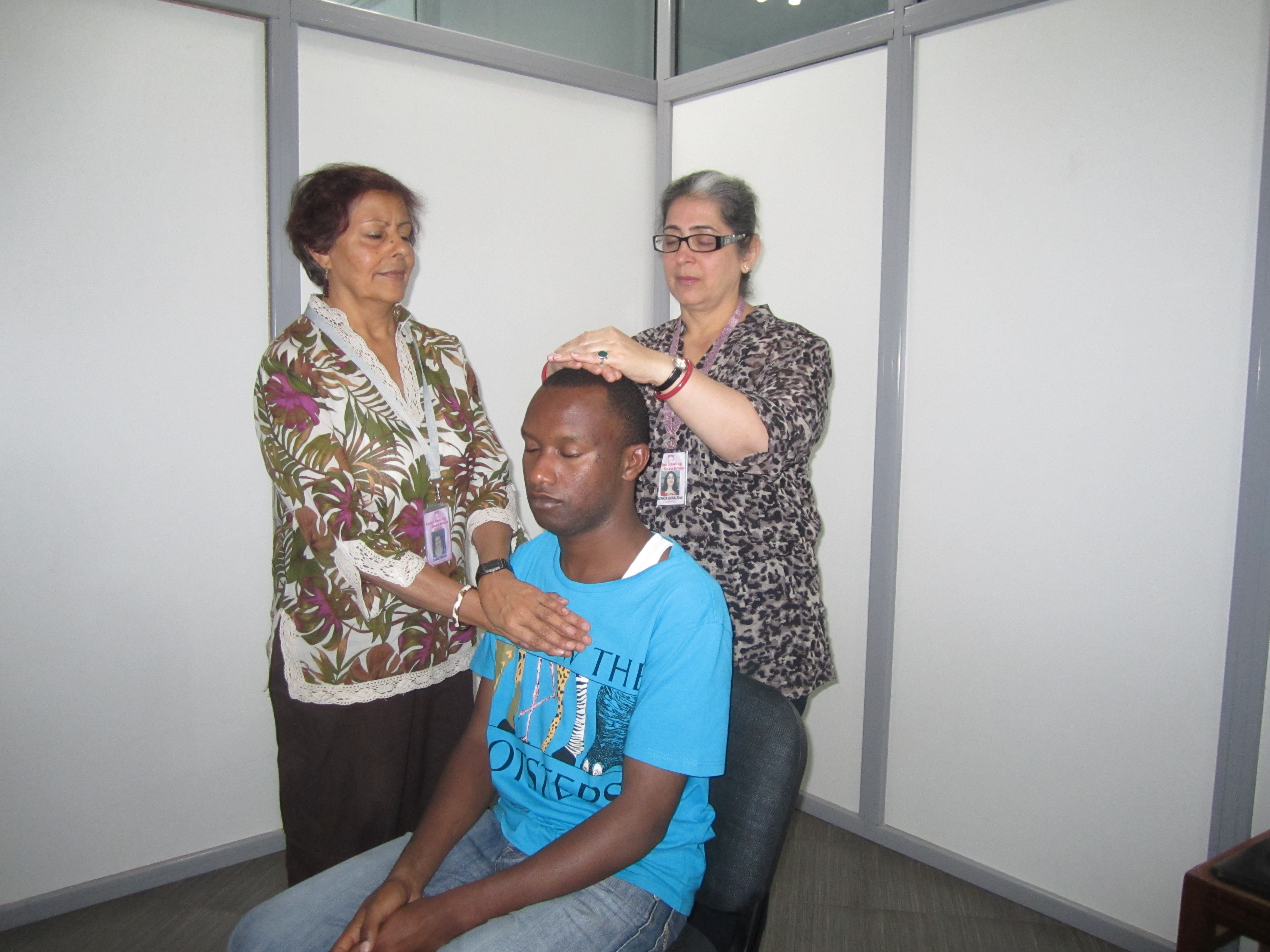 Monica and Saida give Trauma Reiki healing to Simon Muli