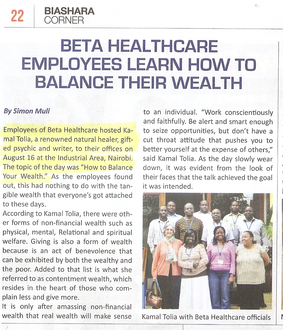 A Talk on Balancing your Wealth …..Reported in the Asian Weekly Newspaper, Nairobi, Kenya.